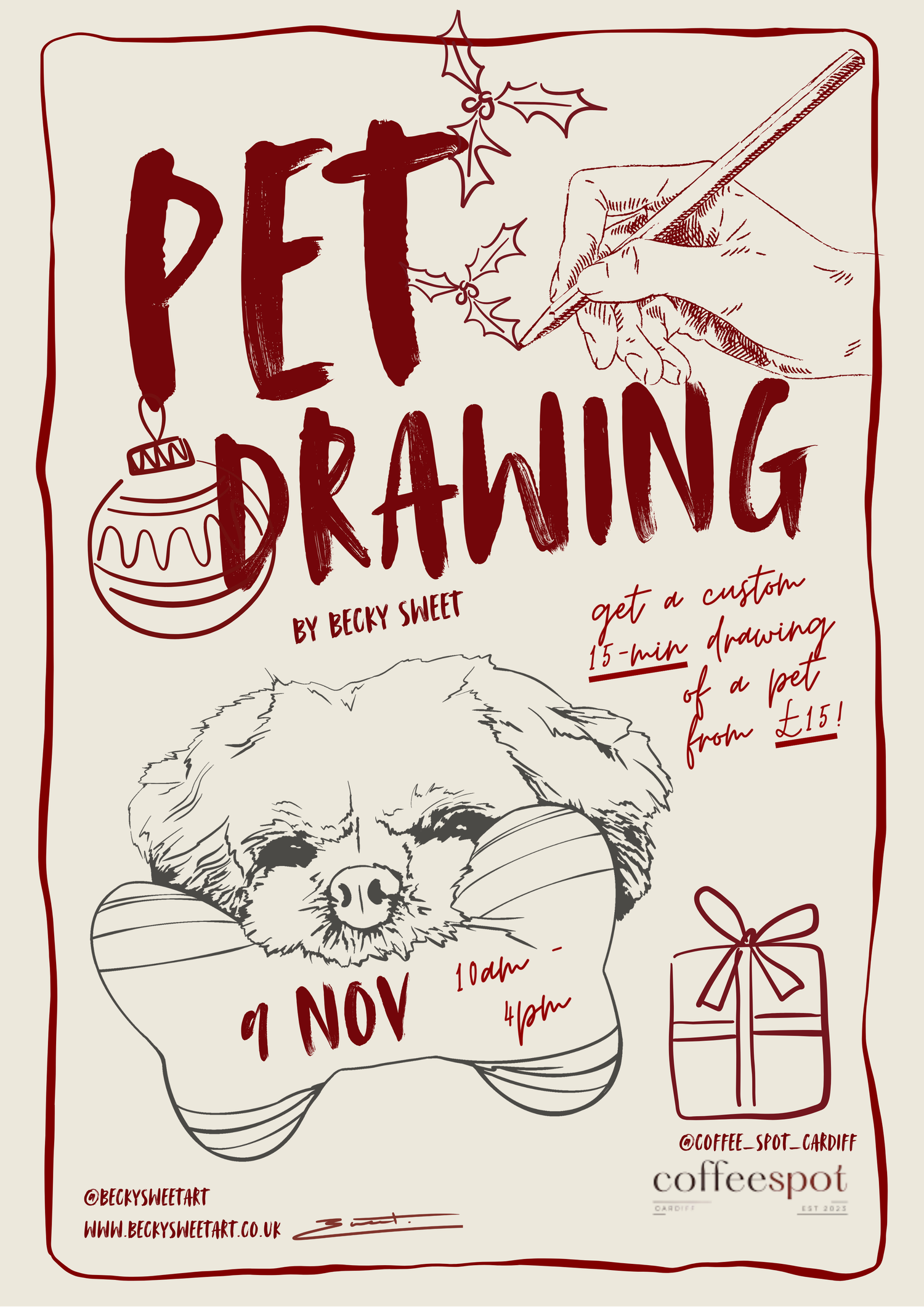As well as Coffee Spot, I will be completing 10-minute drawings of pets (via photos sent to WhatsApp) between 9am and 3:30pm on Saturday, 22nd November 2025 at Sparrow Coffee House, Cardiff!